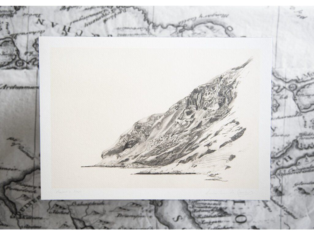 Orientační bod Maclean's Nose nakreslený dřevěným uhlím (autor Reuben Sian de Gourlay) je jaké na etiketě lahve.